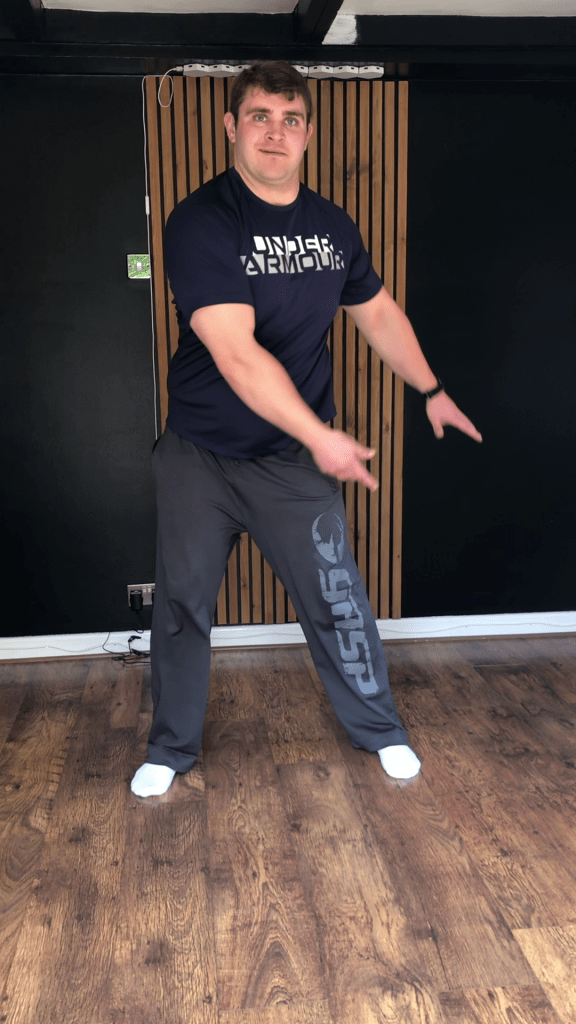 Start by standing with your feet shoulder-width apart, toes slightly turned out, hands both up and by one shoulder.
