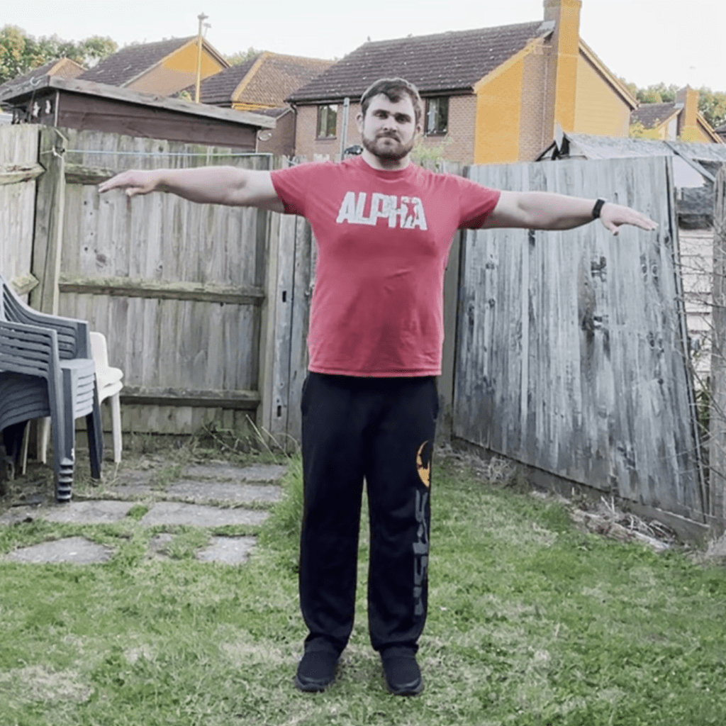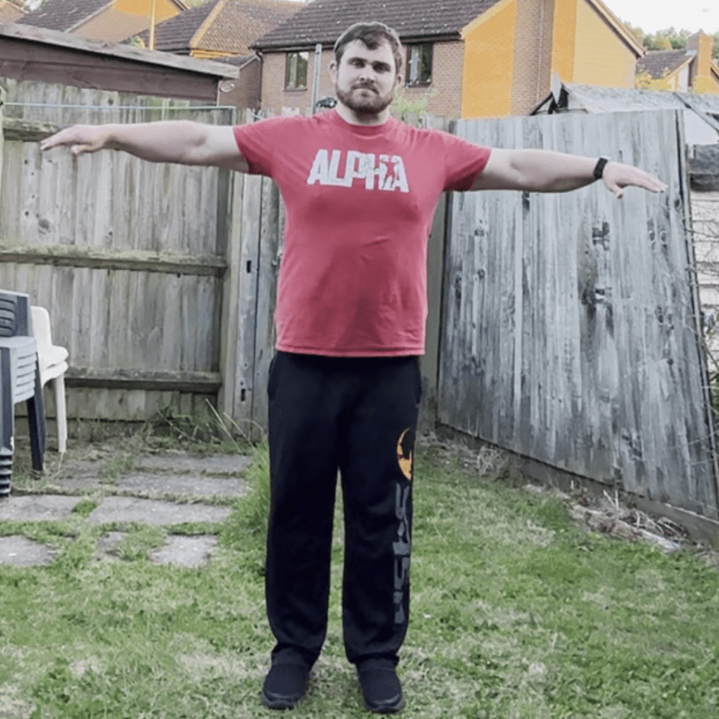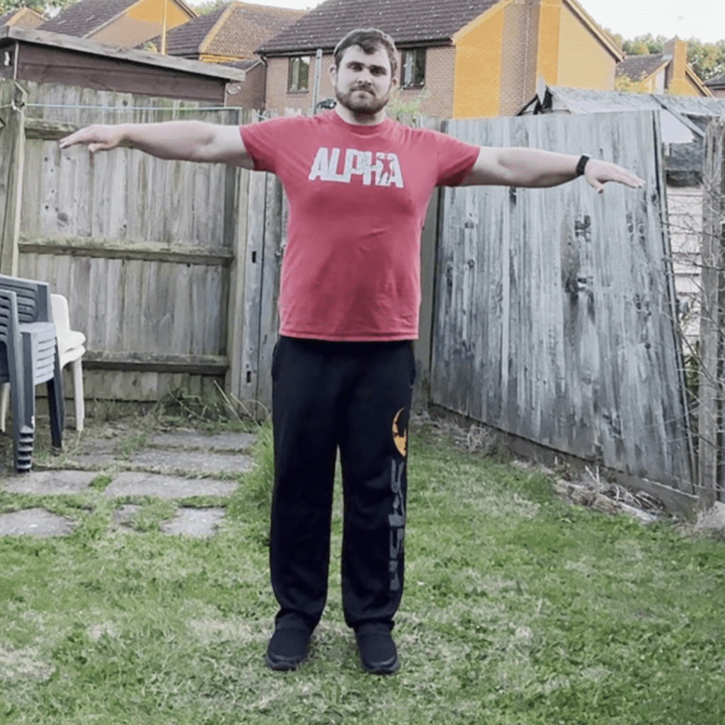 This exercise is where you have you arms raised out to the side of your body and you make circles with your arms rotating forward. Try this exercise for 20 seconds before switching to the next. Make the circles as big as you can with the restriction that your shoulders give you. As you progress you should start to find it easier to make bigger circles with your arms.