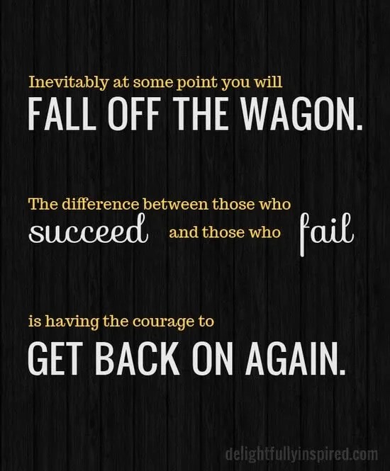 If you are thinking like this then you will always find a reason to not diet properly, or stick with it and you will more than likely find yourself consistently out of shape and in need of “dieting” and training. Inevitably everyone falls into this trap at one time or other and it is easy to do! Falling off the wagon is something which happens to everyone, even the hardened professionals in sport that you see and probably spend time comparing your physique too! It is natural and a normal event so you should stop beating yourself up every time that you do fall away from the desired behaviours and habits. The question then, is how do you get back on track and stay on track with your mission in looking and feeling better?